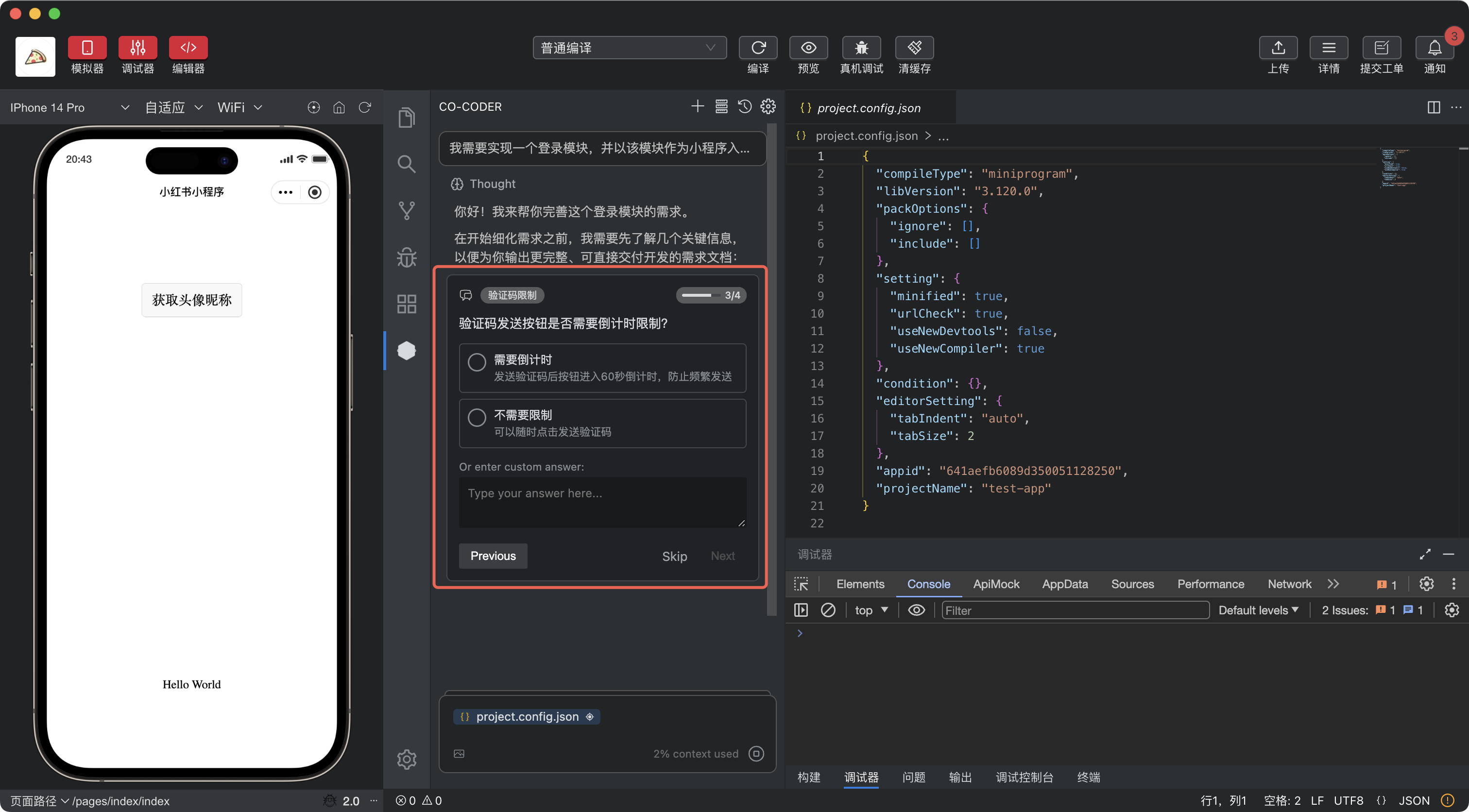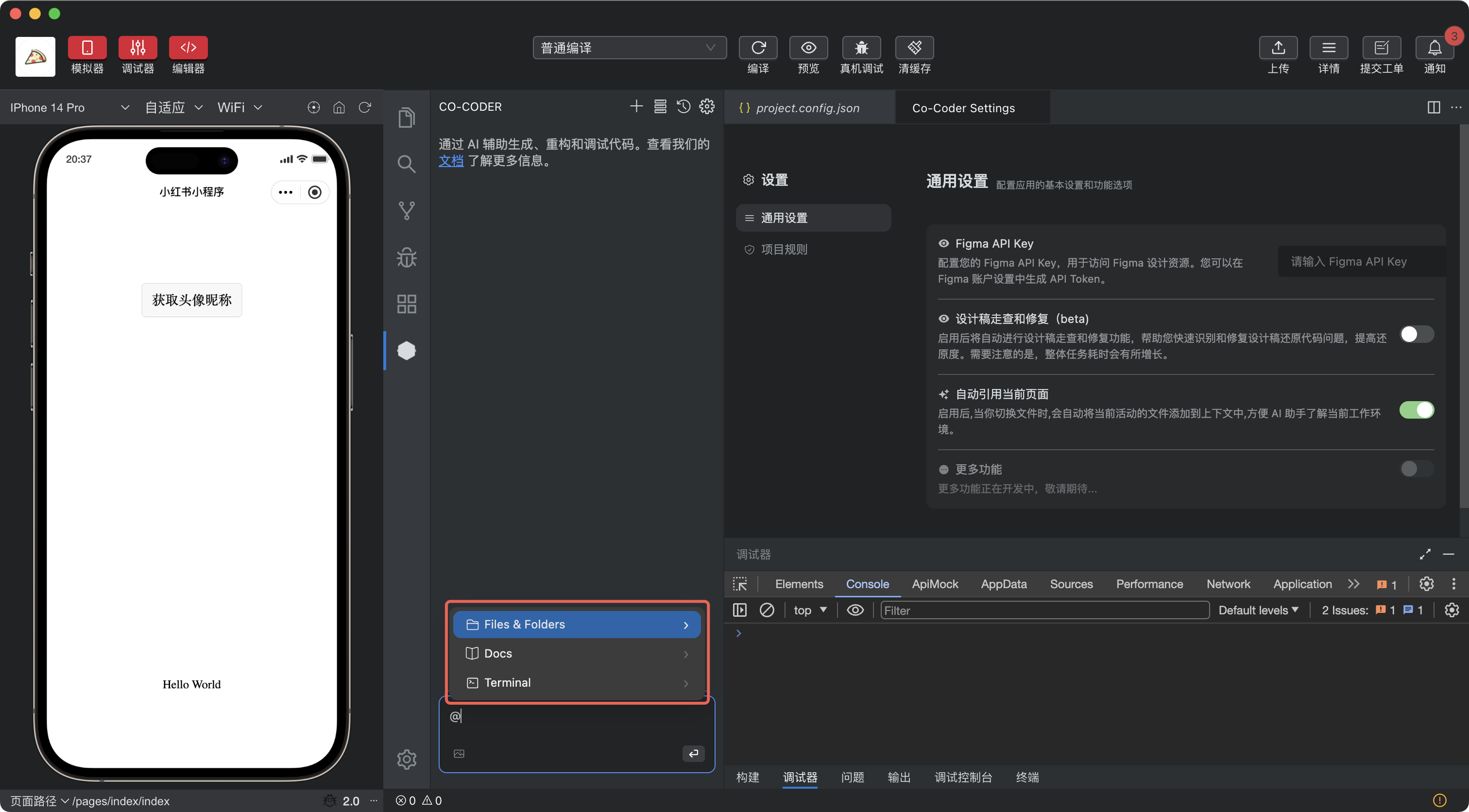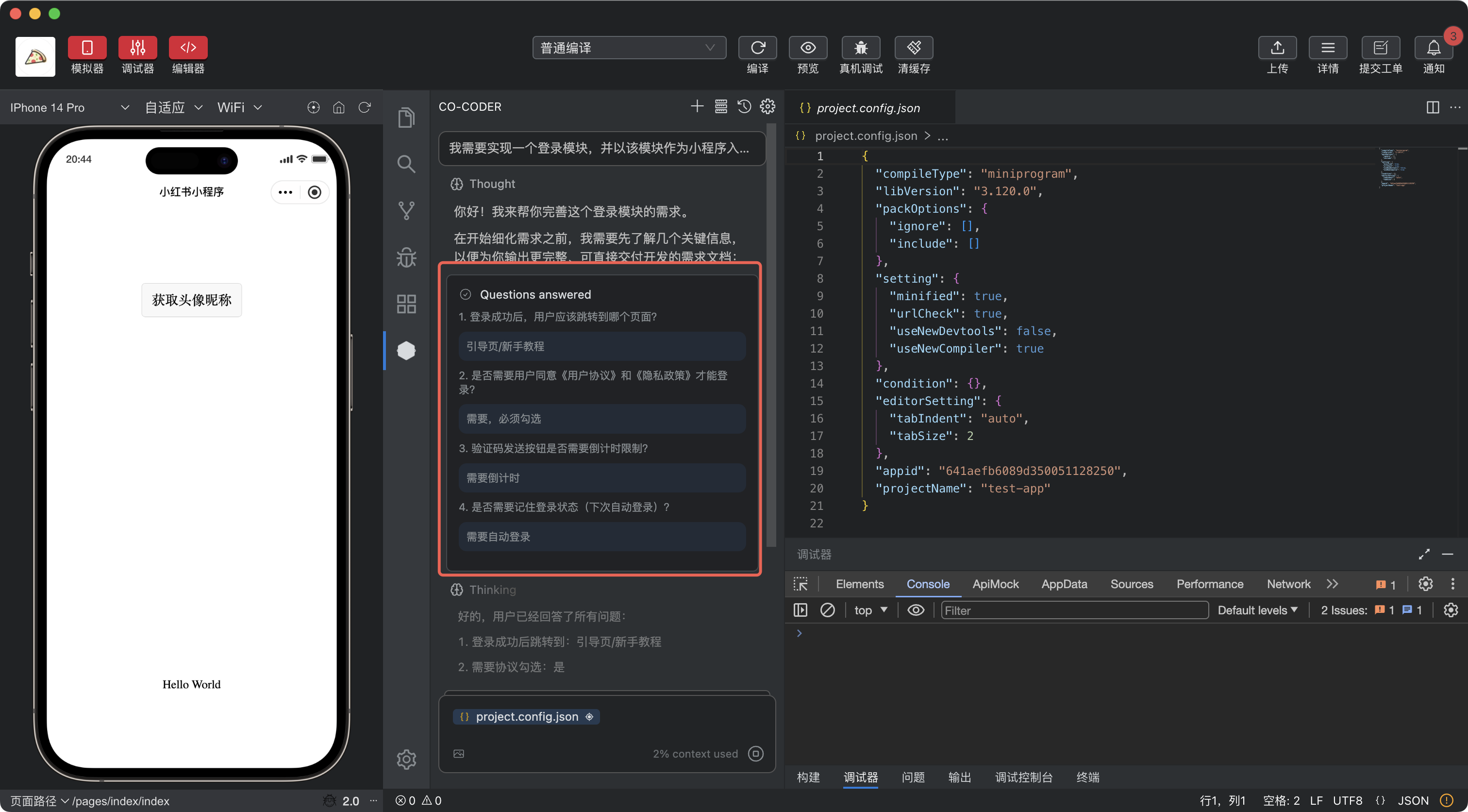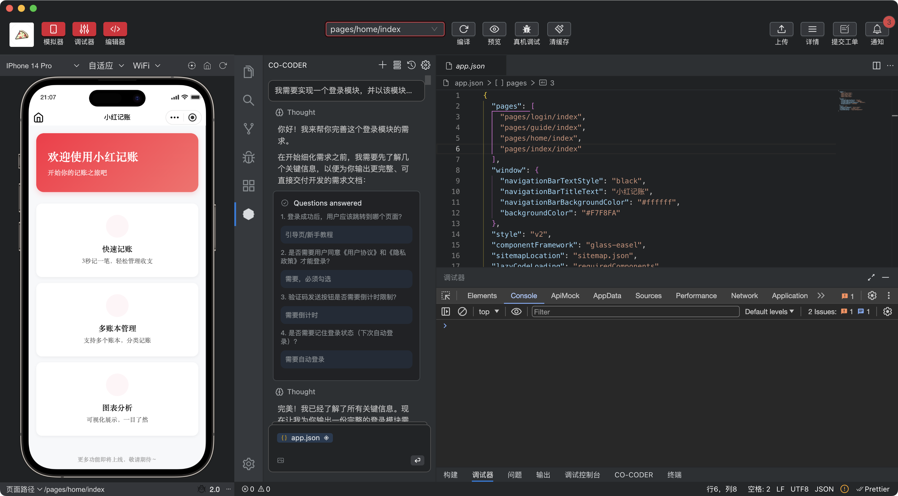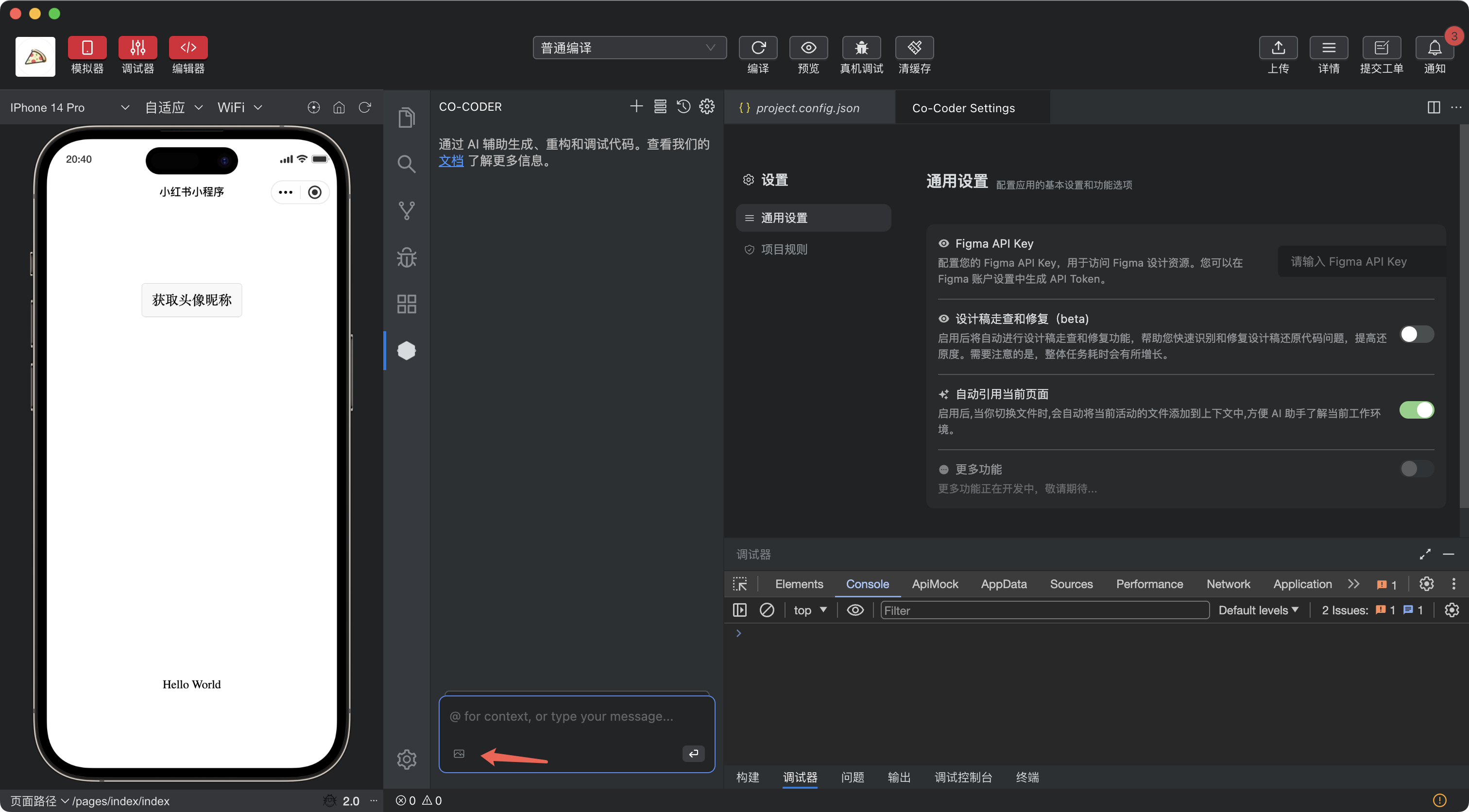 Co-Coder会根据需求分析当前项目的目录结构,对任务进行分解,选择协调的模式,在实现过程中严格执行小红书小程序规范