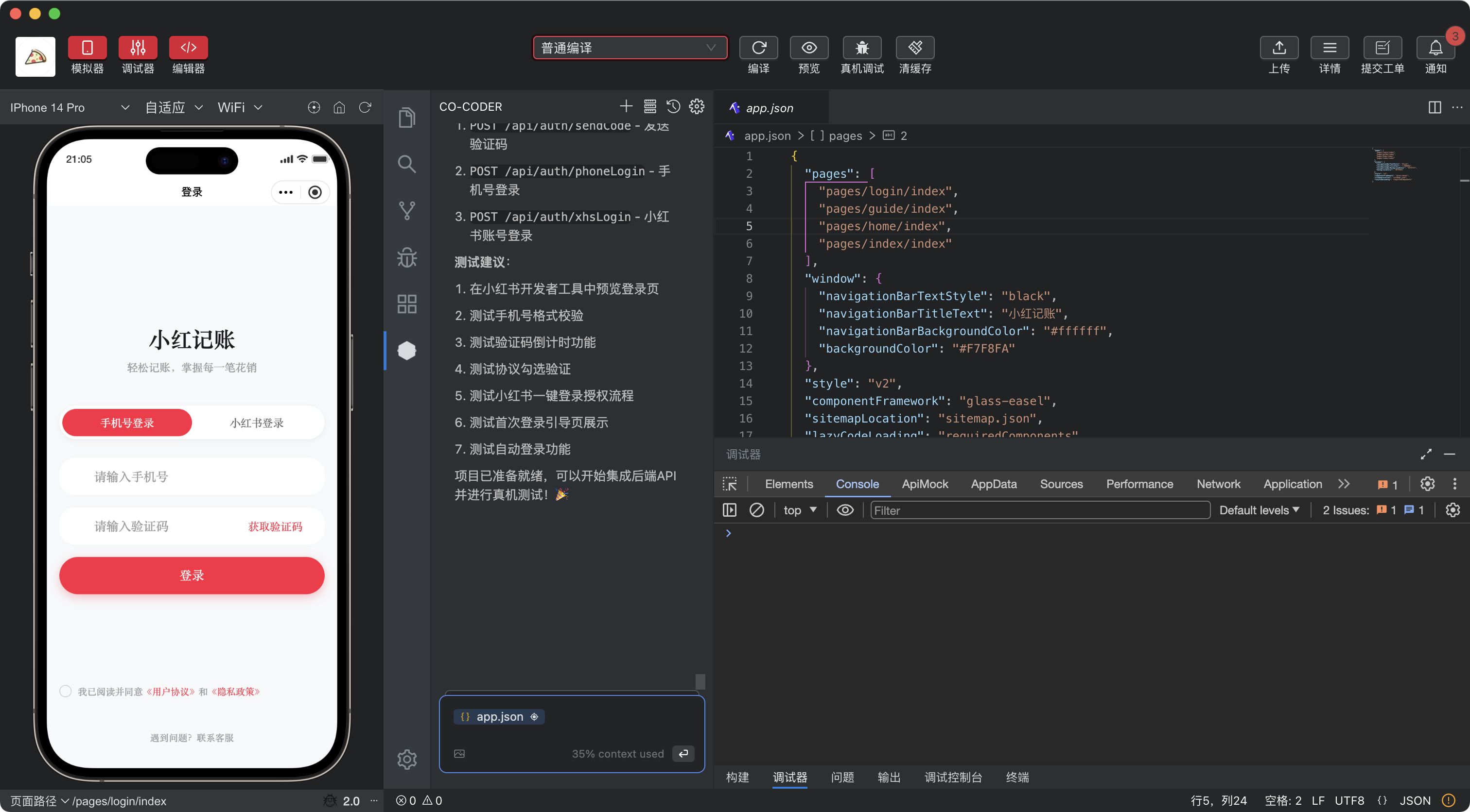 我需要实现一个登录模块,并以该模块作为小程序入口,登录方式有两种手机号+验证码以及小红书账号一键登录,两种登录方式可以切换,页面尽量美观
