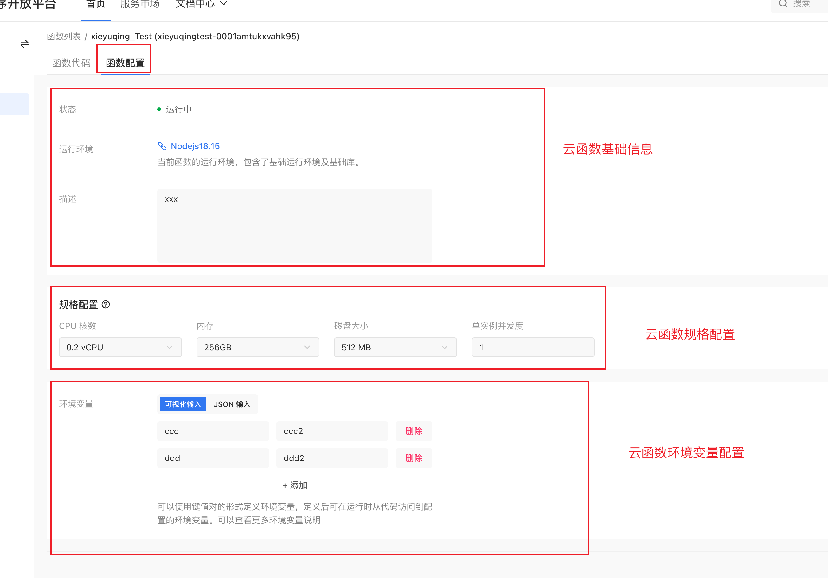 从上往下依次为云函数基本信息、规格配置、环境变量